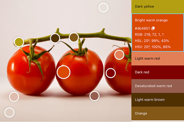 Round markers appear directly on the photo, each representing a sampled color from a specific area.